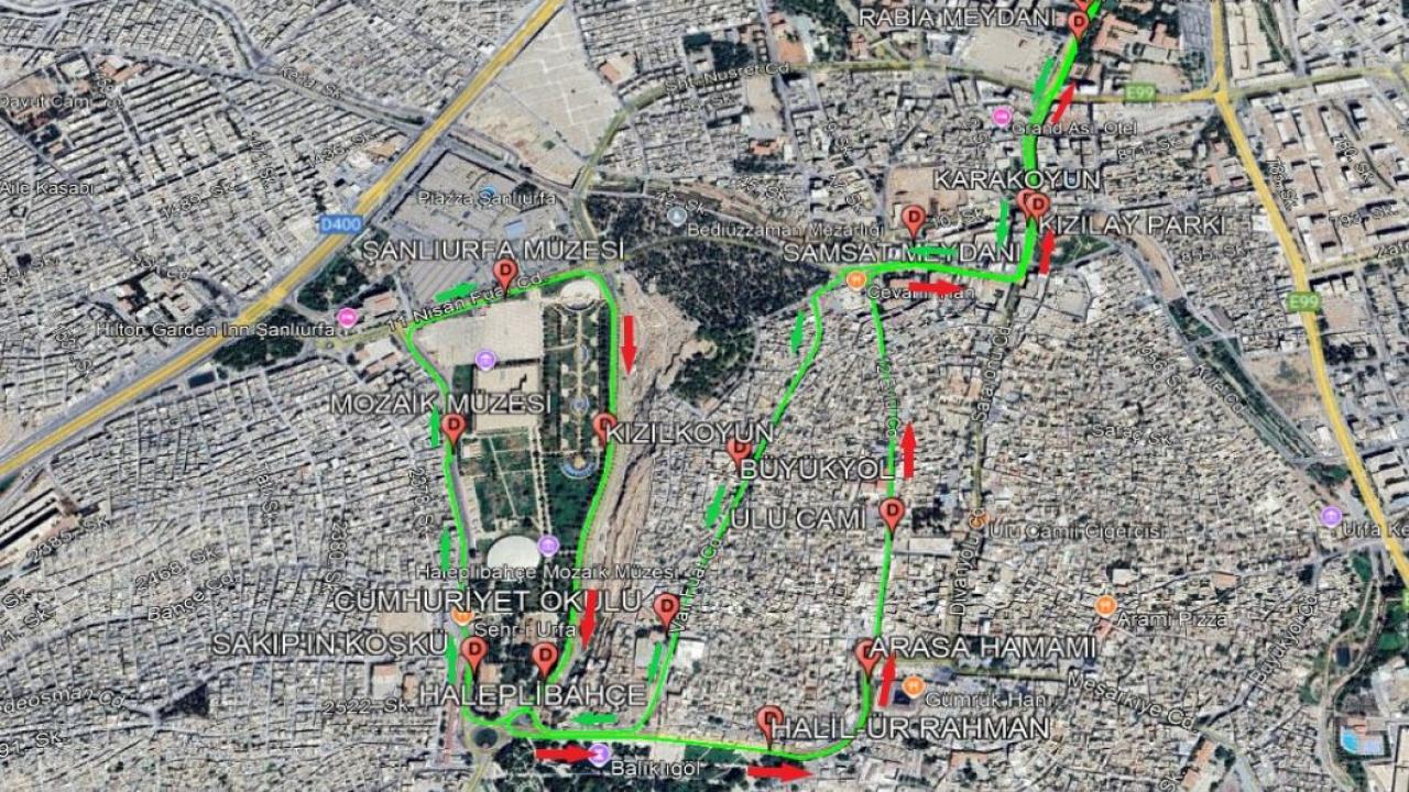 Balıklıgöl - Haleplibahçe - Cumhuriyet Okulu - Sakıp’ın Köşkü-Mozaik Müzesi - Şanlıurfa Müzesi - Kızılkoyun Nekropolü-Arasa Hamamı-Ulu Cami-Samsat Meydanı - Karakoyun - Rabia Meydanı - Aktarma Merkezi (Bitiş)