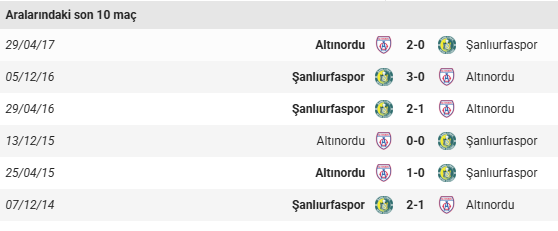 İki takımın yolları son 11 yılda 6 kez kesişti. Bu maçların 3'ü Şanlı takımın, 2'si Altınordu'nun üstünlüğüyle kapandı. Bir maç beraberlikle kapandı.