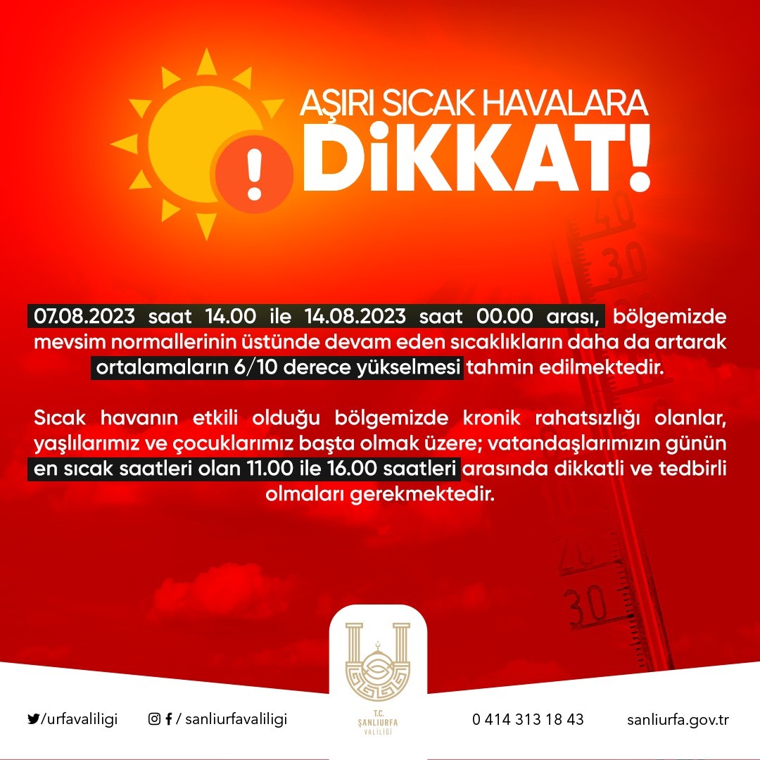 Urfa Valiliği, hava sıcaklıklarının mevsim normallerinin 6 ila 10 derece üzerinde seyredeceğini duyurarak vatandaşları, 11.00 ila 16.00 saatleri arasında dışarı çıkmamaları ve tedbirli olmaları konusunda uyardı.