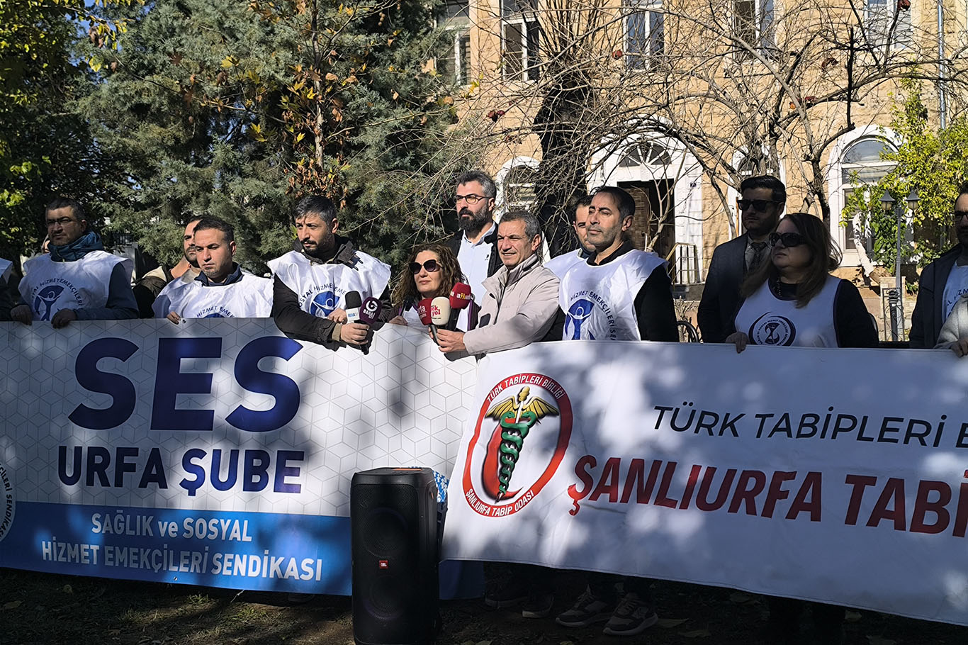Şanlıurfa Tabip Odası ve Sağlık ve Sosyal Hizmet Emekçileri Sendikası (SES) Urfa Şubesi, Aile sağlığı merkezlerinde (ASM) çalışan sağlık personellerinin artarak devam eden sorunlarını çözülmesi gerektiğini belirterek İl Sağlık Müdürlüğü önünde bir basın açıklaması gerçekleştirdi.