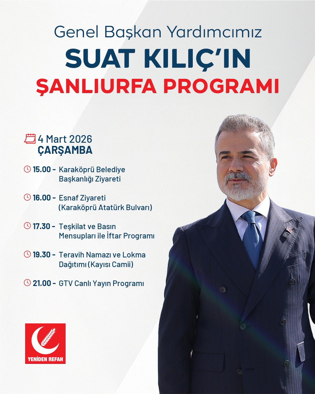 Yeniden Refah Partisi Genel Başkan Yardımcısı eski bakan Suat Kılıç, bir dizi temas ve programlara katılmak üzere bugün Şanlıurfa'ya geliyor.