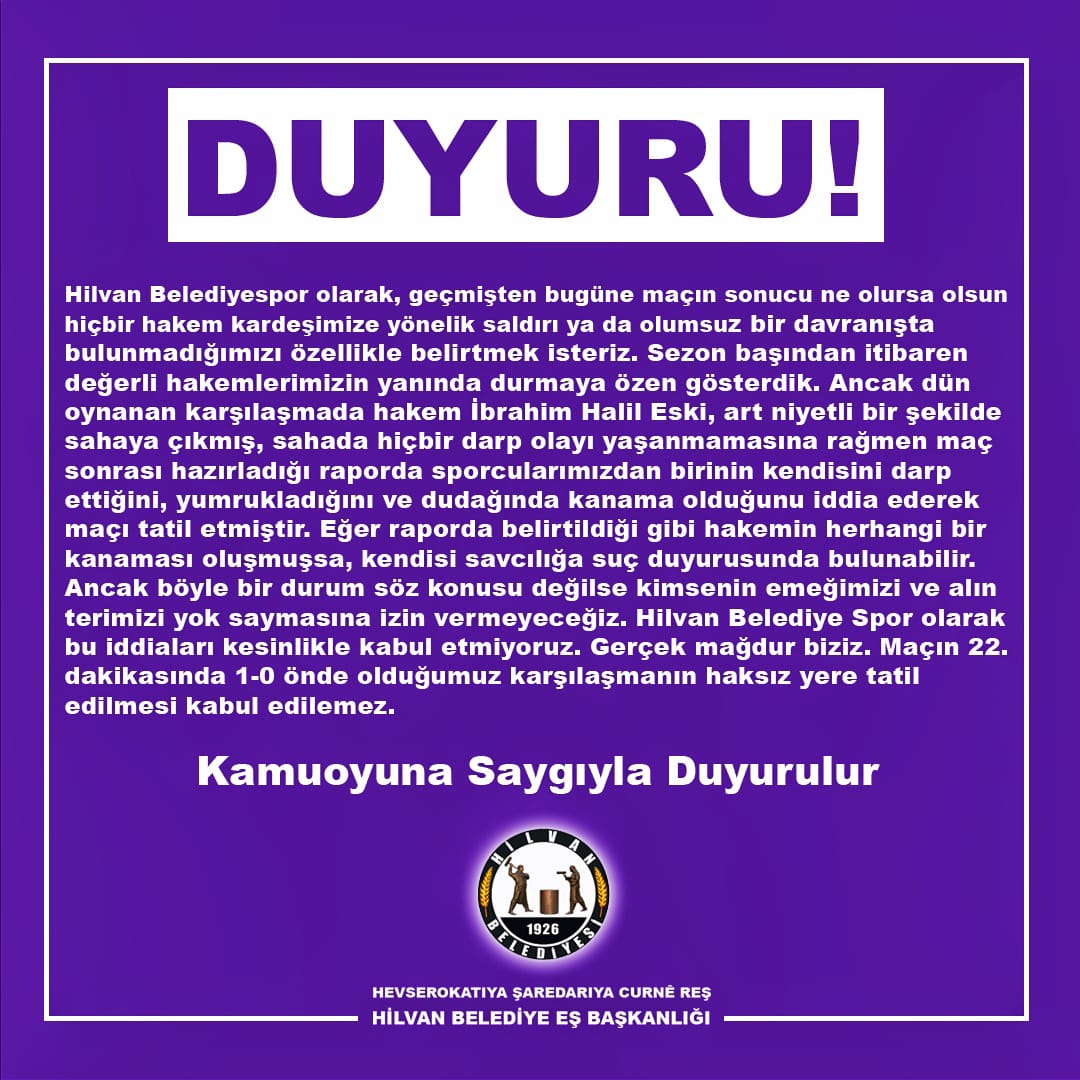 Hilvan Belediyespor’dan yapılan açıklamada, şu ifadelere yer verildi:“Hilvan Belediyespor olarak, geçmişten bugüne maçın sonucu ne olursa olsun hiçbir hakem kardeşimize yönelik saldırı ya da olumsuz bir davranışta bulunmadığımızı özellikle belirtmek isteriz. Sezon başından itibaren değerli hakemlerimizin yanında durmaya özen gösterdik. Ancak dün oynanan karşılaşmada hakem İbrahim Halil Eski, art niyetli bir şekilde sahaya çıkmış, sahada hiçbir darp olayı yaşanmamasına rağmen maç sonrası hazırladığı raporda sporcularımızdan birinin kendisini darp ettiğini, yumrukladığını ve dudağında kanama olduğunu iddia ederek maçı tatil etmiştir. Eğer raporda belirtildiği gibi hakemin herhangi bir kanaması oluşmuşsa, kendisi savcılığa suç duyurusunda bulunabilir. Ancak böyle bir durum söz konusu değilse kimsenin emeğimizi ve alın terimizi yok saymasına izin vermeyeceğiz. Hilvan Belediye Spor olarak bu iddiaları kesinlikle kabul etmiyoruz. Gerçek mağdur biziz. Maçın 22. dakikasında 1-0 önde olduğumuz karşılaşmanın haksız yere tatil edilmesi kabul edilemez.”