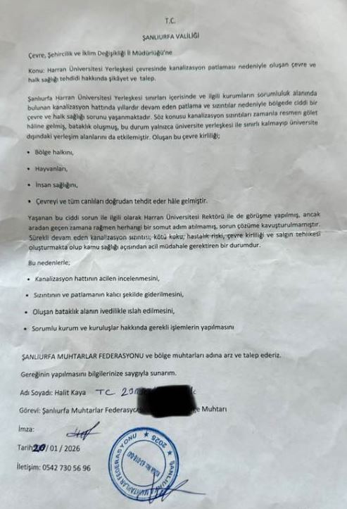 Harran Üniversitesi Osmanbey Yerleşkesi çevresinde yıllardır devam eden kanalizasyon patlamaları ve sızıntılar, çevre ve halk sağlığını tehdit etmeye devam ediyor. Yaşanan sorun için yetkililer, harekete geçti. Muhtarlar Federasyonu Başkanı Halit Kaya, yaşanan soruna dikkat çekerek sorunun acil çözülmesi için Çevre, Şehircilik ve İklim Değişikliği İl Müdürlüğü’ne resmi başvuruda bulundu.