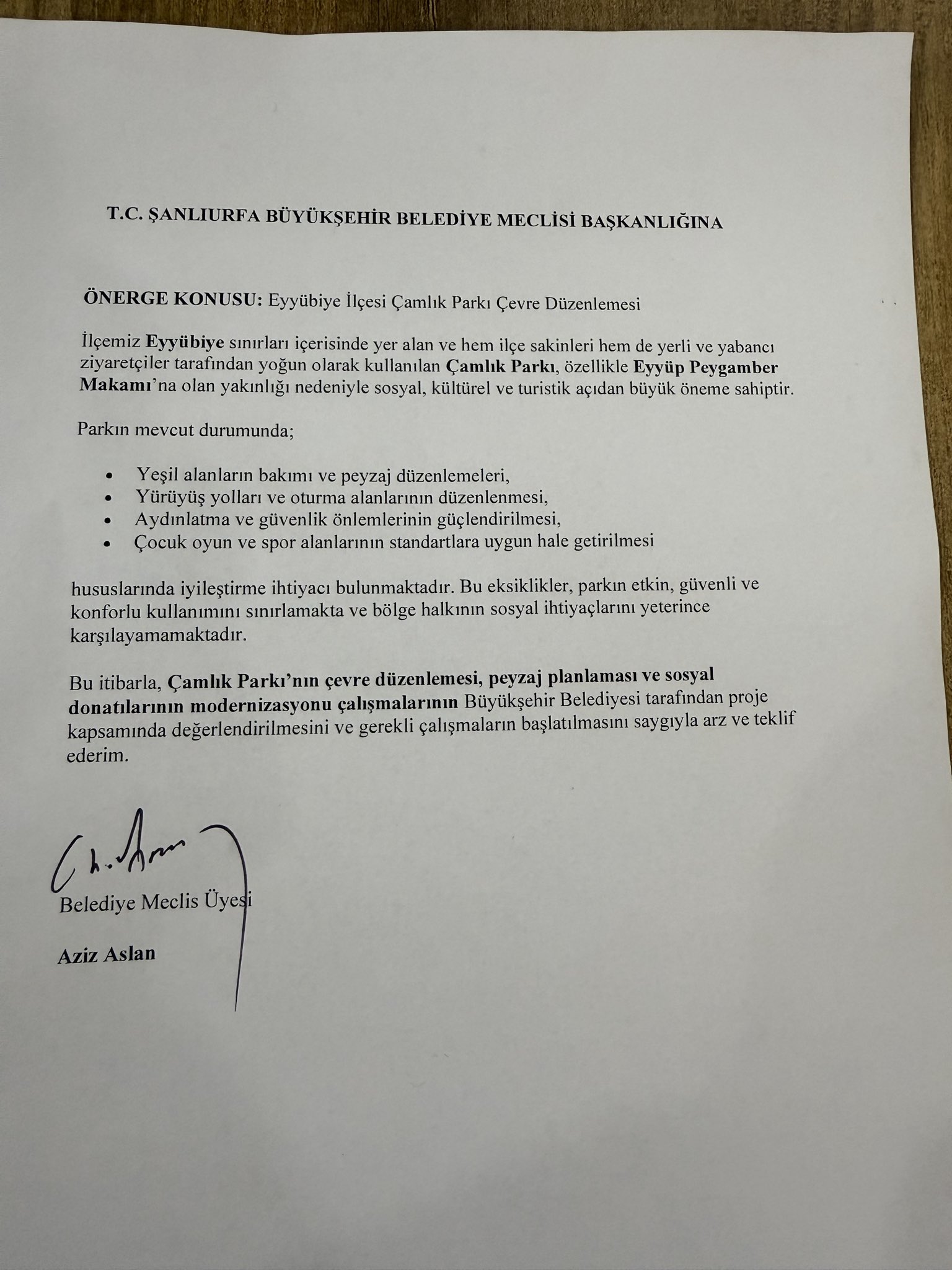 Büyükşehir Belediyesi meclis üyesi Aziz Aslan, Eyyüp Peygamber Makamı yanında bulunan Çamlık Park’ın düzenlenmesi ve Eyyübiye Millet Bahçesi’nin işletme yetkisinin Şanlıurfa Büyükşehir Belediyesi’ne devredilmesine yönelik talepte bulunduklarını belirtti.