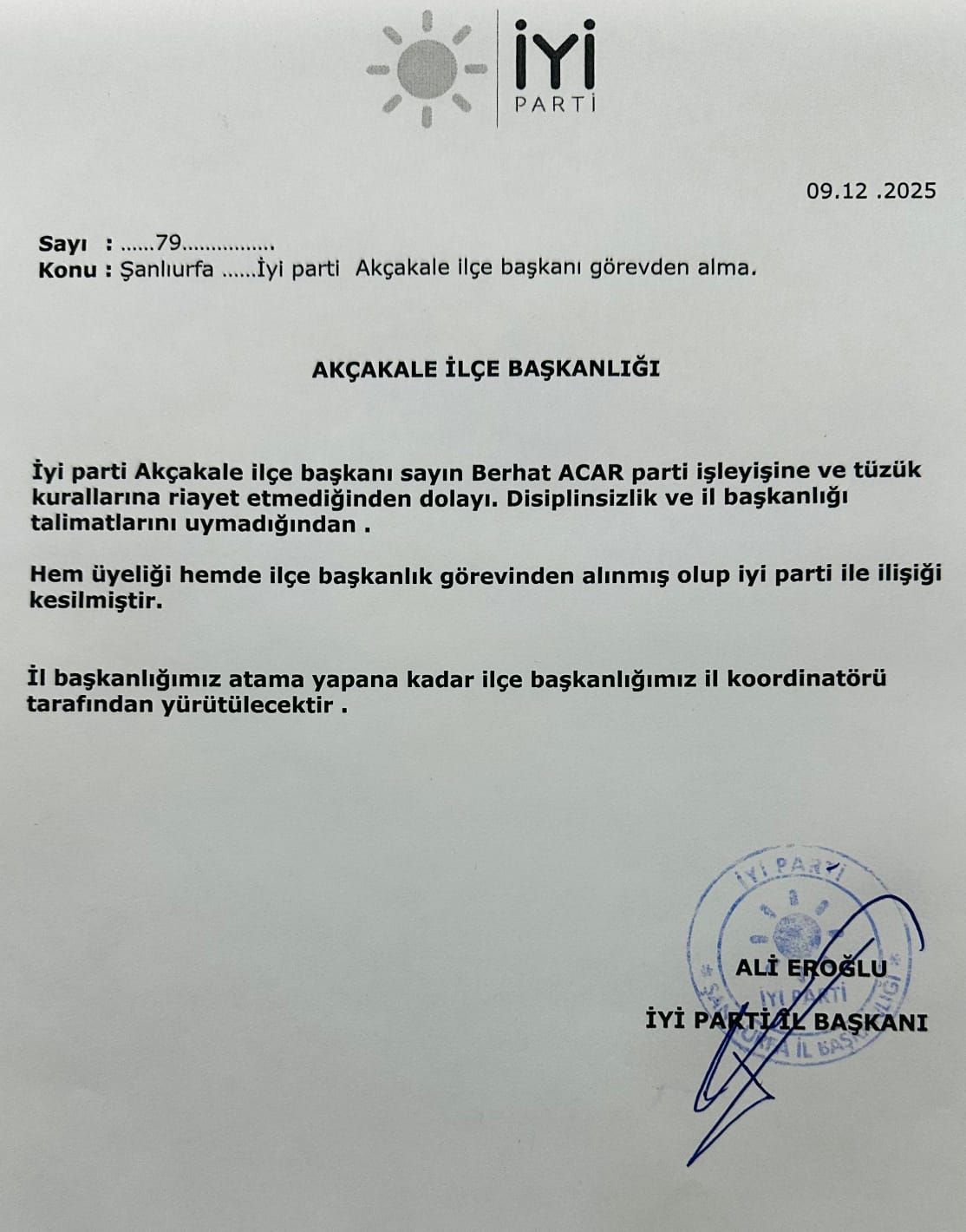 İYİ Parti Akçakale İlçe Başkanı Berat Acar, partisinden istifa ettiğini 2-3 gün önce sosyal medya hesabı üzerinden yaptığı açıklamayla kamuoyuna duyurdu. Yaşanan gelişmelerin ardından İYİ Parti Şanlıurfa İl Başkanı Ali Eroğlu da görevden alma veya istifa süreci ile ilgili açıklama yaptı.