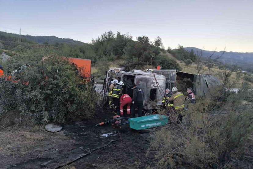 Kaza, Hatay-Adana otobanı Dörtyol ilçesi Hurmalık mevkisinde meydana geldi. Sürücüsünün kontrolünü kaybetmesiyle orta refüje çarpan 63 ADM 974 plakalı tır alevlere teslim oldu.