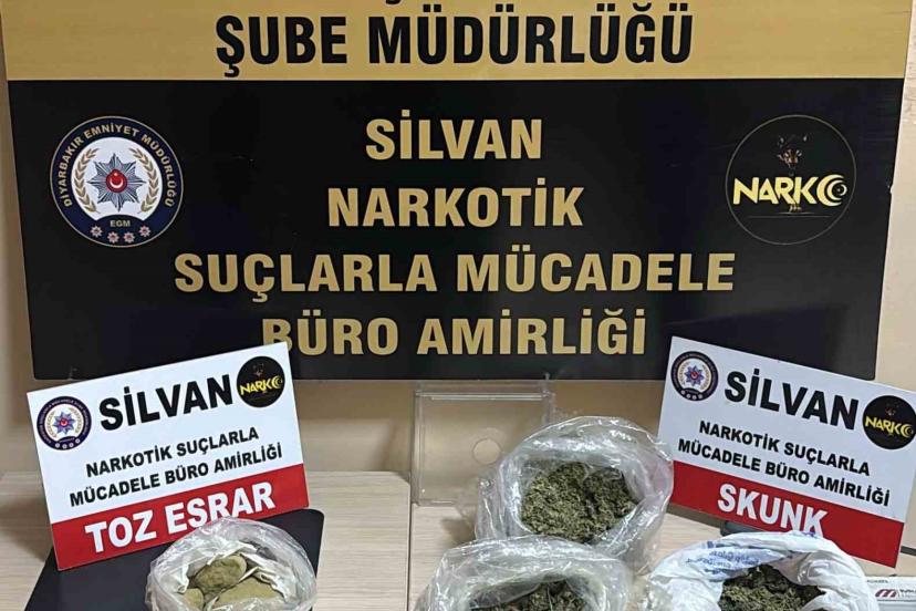 Diyarbakır İl Emniyet Müdürlüğü Narkotik Suçlarla Mücadele Şube Müdürlüğü ekipleri, uyuşturucu madde ticareti yapan şahıslara yönelik Silvan ilçesinde çalışma yürüttü. Silvan İlçe Emniyet Müdürlüğü ile koordineli olarak yürütülen çalışmalar sonucunda belirlenen 5 adrese, şafak vakti eş zamanlı operasyon düzenlendi. Operasyonlarda yapılan aramalarda toplam 450 gram skunk maddesi ile 150 gram toz esrar maddesi ele geçirildi.