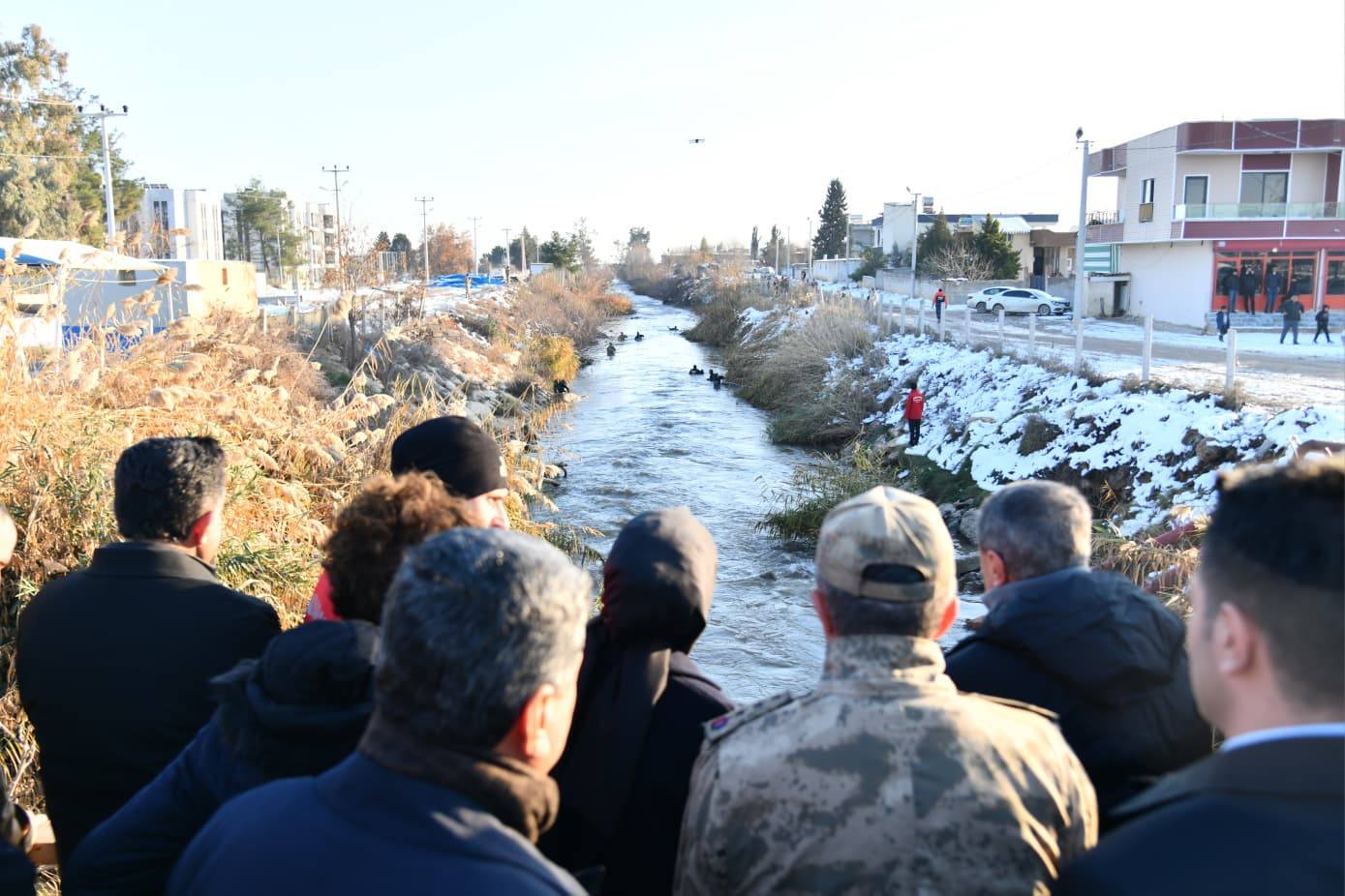 Şanlıurfa’da tahliye kanalına devrilen otomobildeki sürücüye ulaşmak için arama çalışmaları devam ederken Vali Hasan Şıldak ve beraberindekiler de yürütülen çalışmaları yerinde takip etti.