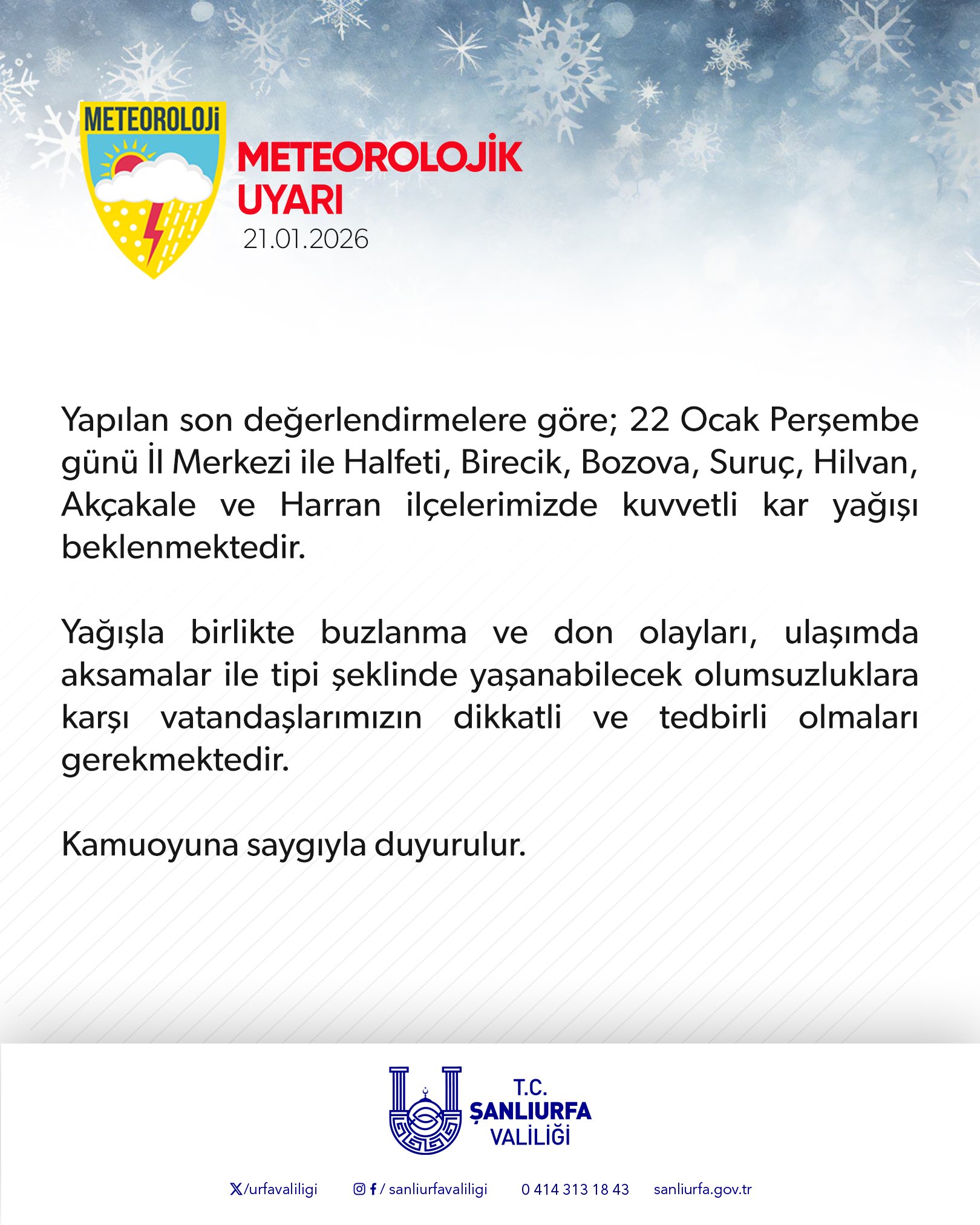 Şanlıurfa’da Valiliğinden yapılan yazılı açıklamada, şu ifadelere yer verildi:“Yapılan son değerlendirmelere göre; 22 Ocak Perşembe günü İl Merkezi ile Halfeti, Birecik, Bozova, Suruç, Hilvan, Akçakale ve Harran ilçelerimizde kuvvetli kar yağışı beklenmektedir.