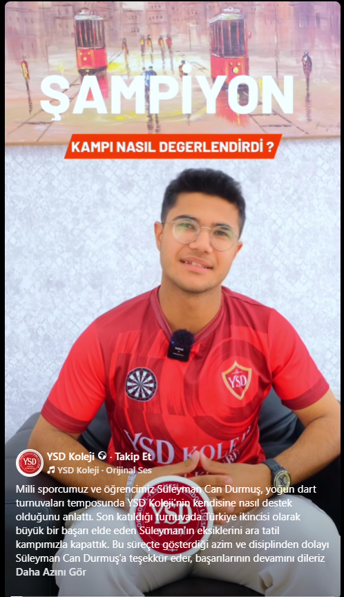 Milli sporcumuz ve öğrencimiz Süleyman Can Durmuş, yoğun dart turnuvaları temposunda YSD Koleji’nin kendisine nasıl destek olduğunu anlattı. Son katıldığı turnuvada Türkiye ikincisi olarak büyük bir başarı elde eden Süleyman’ın eksiklerini ara tatil kampımızla kapattık. Bu süreçte gösterdiği azim ve disiplinden dolayı Süleyman Can Durmuş’a teşekkür eder, başarılarının devamını dileriz